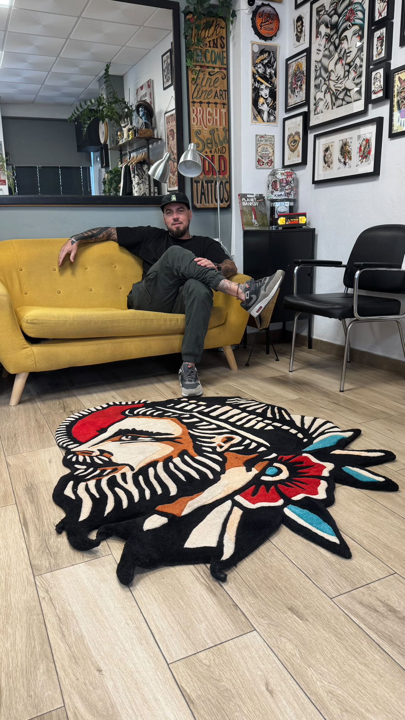 We first met @ArielDiSabato at the London tattoo convention and instantly knew his style would transfer perfectly to a rug. Born in Argentina and based in Malaga, you can find him at luckytuesday.tattoo- he’s a vet at traditional art so check his work out, and if you’re local, get a tattoo by him 🤟