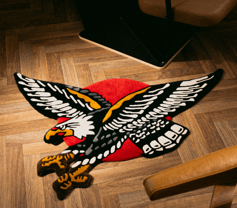 @Duncansweeny is a close friend of the brand and is responsible for most the tattoos you see on me. I spotted one of his flash designs on the wall while getting tattooed, and we decided it would be a sick rug. From the shop wall to the floor. We love duncans work and expect to see more collabs with him in the future.